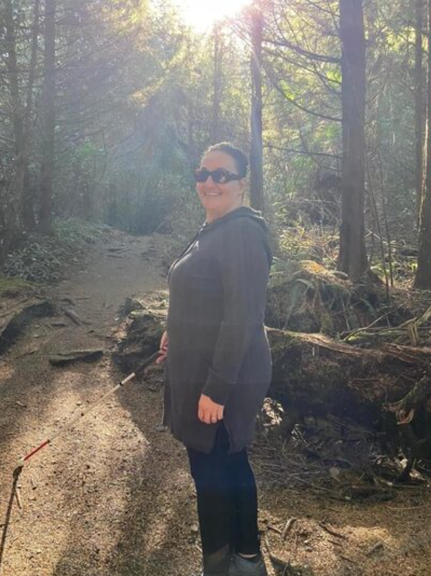 For everyday travel and navigation, I use a long white rigid cane with a metal tip. On this day, I found that this trusted mobility device, which gives me confidence, was not cooperating on that type of terrain. Because of its flexibility, it regularly caught roots, rocks, and sticks. They flicked and wobbled my cane in the air, rendering it not safe or effective. The journey to see the tide pools ended before we made it, as the layers of frustration got the better of me. I said I would never do that trail again.