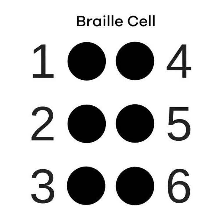 A Braille cell is comprised of raised dots arranged in two columns and 3 rows. Each dot has a number from 1 to 6. The top left corner of the cell is dot 1. Moving down the column to the middle row is dot 2, and in the bottom left corner is dot 3. In the top right corner is dot 4, the middle dot in theright column is dot 5. The bottom right corner is dot 6. A full Braille cell is all 6 dots.